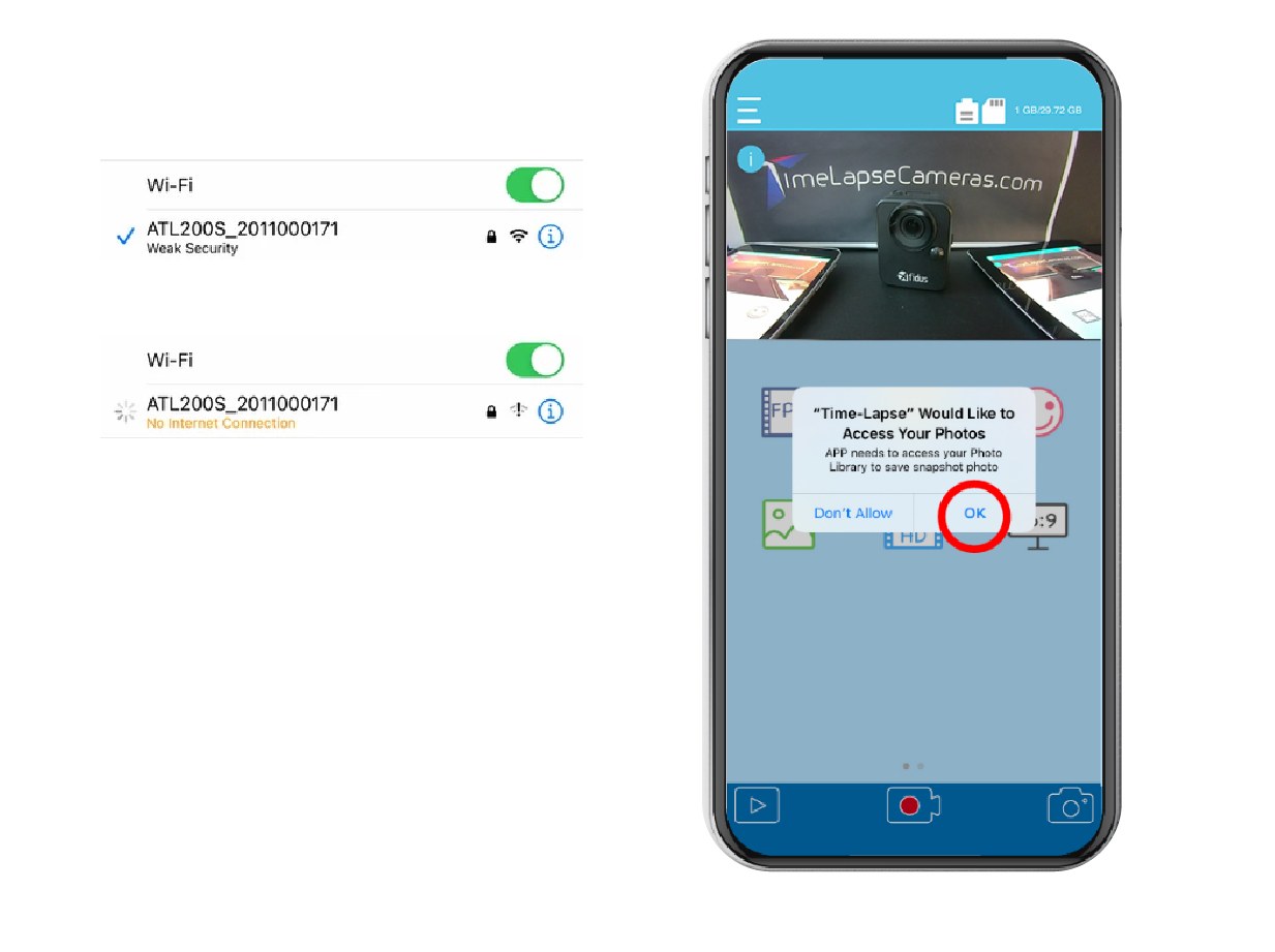 This article is for users who are connecting to Afidus timelapse camea for the first time. Always start with brand new alkaline battery and install supplied 16gb mSD, press and hold the power button to boot up camera until hearing a "beep". the LED will light up green LED. Go back to mobile phone and search for the Wi-Fi network of the camera, the name is "ATL230_xxxxxxxxx", connect your mobile phone to this network and enter the default password "12345678". Please notice that a message might pop up on your phone stating "There is no Internet connection for this Wi-Fi connection", this is an additional notification for certain devices, but don't worry, when you see a blue check mark (tick), you are connected and you can continue to open the Afidus APP. At the first time entering the APP, the APP will also ask if you want to allow the APP to access the photo album on your phone. Please select "OK", otherwise the camera will not be able to connect to your devices. The APP will instruct you to enter a new WIFI password. Once the new password has been set, go back to your WIFI network list and click on "Forget Network" to the right of your ATL camera Wi-Fi. Afterwards, reconnect to the ATL230 xxxxxxx network using your new personal password. Please note. The ATL230 will automatically turn off after 4 minutes not activities or operation(no recording or settings are activated), and a long beep will sound to alert you that it is switching off.
